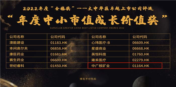中廣核礦業榮獲格隆匯金格獎“年度中小市值成長價值”及“年度卓越領袖”獎項