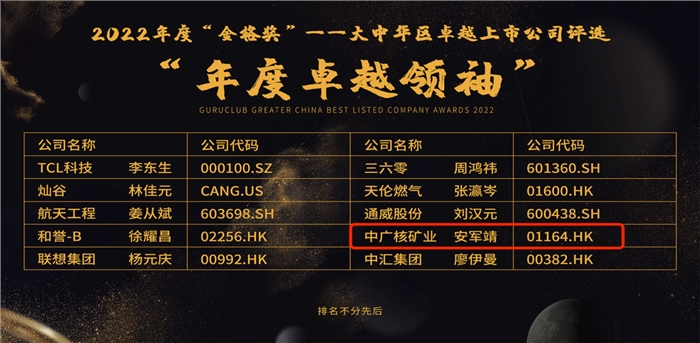 本次獲獎顯示出市場及投資者對安軍靖先生及中廣核礦業在資本市場上的突出表現所給予的充分肯定和高度評價,同時也凸顯了資本市場對天然鈾行業前景及公司潛力的極大認可。中廣核礦業將持續耕耘,繼續致力于推動行業發展,優化社會環境治理及可持續發展,努力開拓市場,不斷提升企業價值,用更加優異的成績回報各位股東。