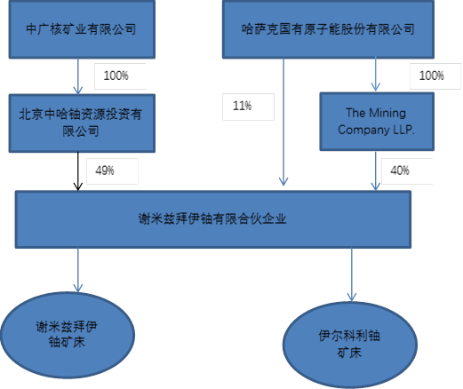 2015年中廣核礦業完成哈薩克斯坦謝米茲拜伊鈾有限合伙企業49%股權的收購,并獲得旗下兩座在運營鈾礦山(謝米茲拜伊鈾礦床和伊爾科利鈾礦床)49%的天然鈾產品包銷權,成為一家主業清晰的鈾資源開發和貿易公司。