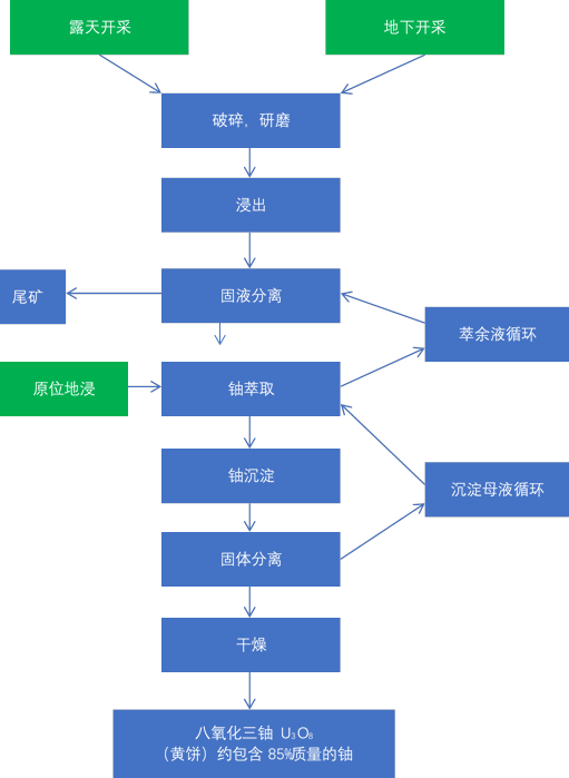 世界主要鈾礦的開采方式包括三種:原位地浸開采,露天開采及地下開采。世界約48%的天然鈾通過原位地浸開采生產(chǎn)出來,46%來自于常規(guī)開采方法(露天開采及地下開采)生產(chǎn)出來,6%作為其他礦產(chǎn)品副產(chǎn)品采出。 鈾礦開采生產(chǎn)工藝示意圖 2017年世界各國產(chǎn)鈾比例(總產(chǎn)量為59,531噸鈾) 原位地浸開采 原地浸出采鈾是將溶浸液通過注液鉆孔注入到可滲透的含礦含水層,使溶浸液在滲透過程中與鈾接觸并進(jìn)行溶解反應(yīng),生成含鈾溶液,并從抽液孔被抽至地表,輸送到車間加工處理后獲得鈾產(chǎn)品的流程。 ? 適用賦存于含水及可滲透砂巖中鈾礦物開采。 ? 圈定鈾礦的邊界品位為0.001%。 ? 根據(jù)浸出機(jī)理的不同,分為酸法和堿法開采。 開采的適用條件: (1)含礦巖性應(yīng)為具有滲透性的砂巖、砂礫巖。礦體賦存于地下水位以下的含礦含水層中。充水性和滲透性是地浸是否可行的決定性因素。 (2)礦體產(chǎn)狀平緩(傾角一般小于10度),礦體頂?shù)装鍛?yīng)是良好封閉的不透水層。 (3)礦床平米鈾量應(yīng)在最低經(jīng)濟(jì)指標(biāo)之上,含礦含水層中碳酸鹽含量>2%則不宜用酸法浸出。圍巖以長石石英質(zhì)或石英質(zhì)砂巖最宜。 (4)按照目前鈾價(jià),開采礦體最大埋藏深度不宜超過400-600m。 浸出機(jī)理 酸法 主要使用硫酸作為溶浸劑,礦石中鈾隨溶浸液pH值的下降2以下后從沉淀態(tài)變?yōu)槿芙鈶B(tài),生成硫酸鈾酰溶液。含礦含水層中碳酸鹽含>2%則不適用。 堿法 主要使用碳酸氫銨作為溶浸劑,礦石中鈾隨溶浸液pH值上升到9以上后礦石中的6價(jià)鈾與碳酸鹽中的碳酸根(CO32-)絡(luò)合,生成碳酸鈾酰溶液。產(chǎn)品液鈾含量低,銨鹽也造成地下水污染。 二氧化碳+氧氣 原理是氧氣氧化礦石,在地下水中加入二氧化碳后,形成的碳酸氫根(HCO3-)離子與礦層中的鈾發(fā)生反應(yīng),使鈾溶解在溶液中,也屬于堿法浸出分類。 細(xì)菌浸出 主要選用氧化鐵硫桿菌,在浸出鈾的過程中,主要起間接催化作用,能促進(jìn)黃鐵礦和硫酸亞鐵的氧化,促進(jìn)6價(jià)鈾生成。可降低酸耗。需配合酸法使用,但并非一種獨(dú)立的浸出方法。 地浸的主要優(yōu)點(diǎn): (1)開采方法安全簡單、工藝流程短。采礦階段無需搬運(yùn)、破碎礦石,水冶階段無需磨礦和固液分離,縮短了采冶工藝流程,直接生產(chǎn)成本低。 (2)礦山建設(shè)周期短、基建投資少,勞動(dòng)強(qiáng)度低、自動(dòng)化程度高,固定資產(chǎn)折舊低。 (3)環(huán)境污染小。一是抽注基本平衡,地浸溶液是在閉路管道內(nèi)循環(huán)使用,其廢水排放量顯著減少;二是放射性粉塵污染得到徹底改善;三是尾渣和廢氣的污染減到了最低程度。 露天開采即一個(gè)移走礦體上的覆蓋物,從敞露地表的采礦場采出鈾礦物的過程。主要適用于主礦體埋藏較淺的鈾礦床開采。 主要優(yōu)點(diǎn)包括: 1. 基建周期短。2-4年/大型 6-8月/小型。 2、開采空間大,勞動(dòng)生產(chǎn)率高。比地下開采高2-10倍。 3、礦石損失、貧化率較小。損失率3%-5%貧化率5%-8%。 4、開采成本低,勞動(dòng)條件好,生產(chǎn)安全。 主要缺點(diǎn): 1、開采受到氣候影響大。 2、基建設(shè)備投資大。 3、礦山占地多,對地表環(huán)境破壞大。 地下開采即通過開掘井巷工程從地下礦床的礦塊里采出礦石的過程,通過礦床開拓、礦塊的采準(zhǔn)、切割和回采4 個(gè)步驟實(shí)現(xiàn)。主要適用于埋藏較深及地表不允許露天開采的鈾礦床。以地壓管理方法為依據(jù),分為空場采礦法充填采礦法、崩落采礦法三大類。